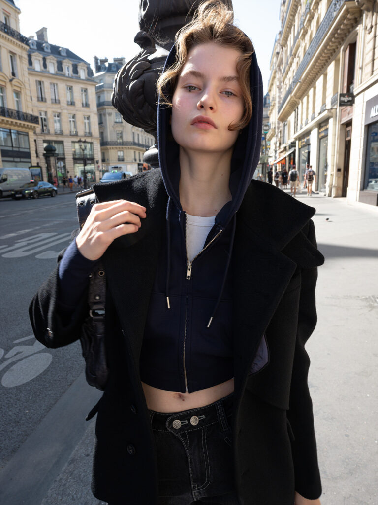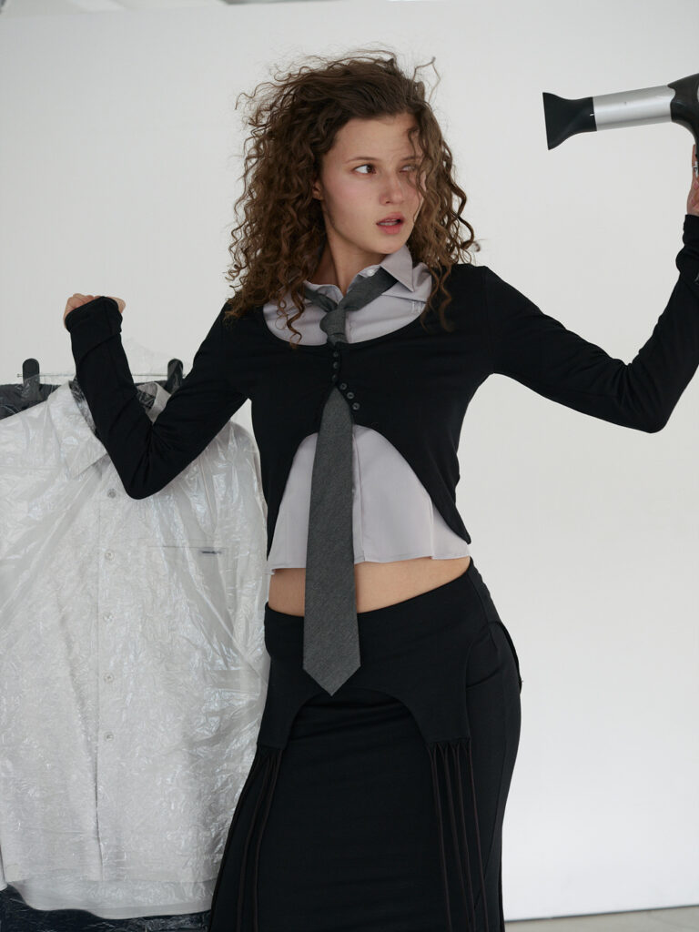 프리미엄 라인에서는 울과 앙고라 혼방 소재의 ‘울 하프 코트’가 눈길을 끕니다. 독특한 쉐입의 천연 소뿔 단추와 피코트의 정제된 실루엣이 고급스러움을 더하며, 목과 몸판의 덧장 디테일로 다양한 스타일 연출이 가능합니다. 세 가지 소재를 믹스한 ‘어시매트릭 언발란스 레이어드 스커트’는 단추 디테일로 스타일링의 유연성을 높였고, 메리노 울 혼방 소재의 ‘레이어드 니트’는 비대칭 구조와 밑단 마감이 돋보이는 아이템입니다. 두 아이템 모두 단추를 활용해 다채로운 스타일링을 연출할 수 있습니다.
